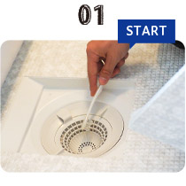 排水栓と排水口部のゴミや髪の毛を歯ブラシや綿棒で取り除き、排水口部の汚れをスポンジで落とします。