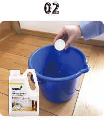 バケツに1ℓの水を汲み、キャップ1杯(約10cc)のウォッシュ&ケアーを薄めます。